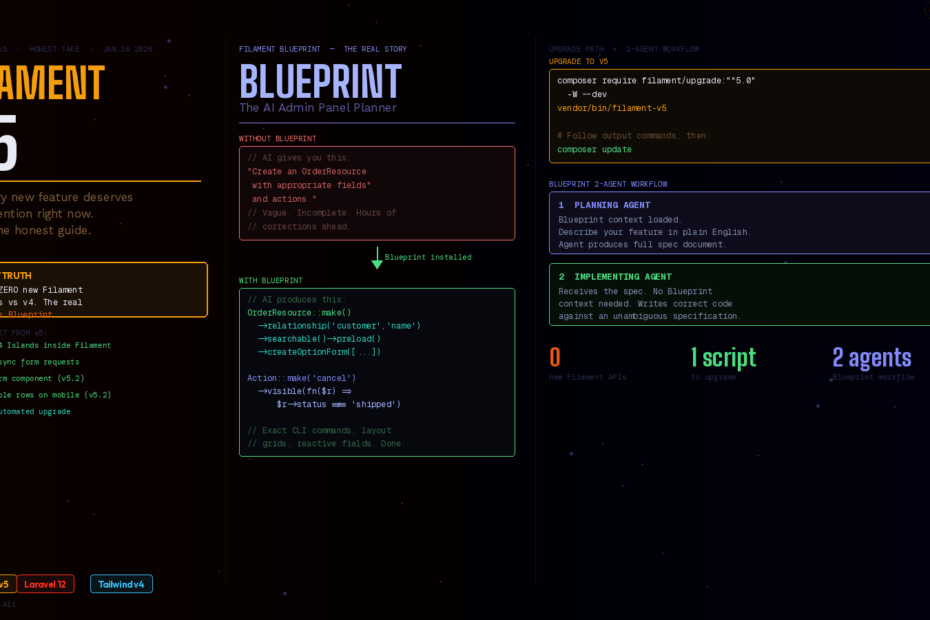 So before you feel short-changed — understand what you’re actually getting when you upgrade to v5. And then understand the thing launched alongside v5 that nobody’s talking about enough: Filament Blueprint.