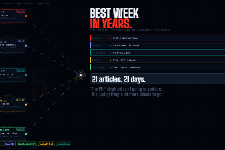 This week felt like another inflection point. Not as dramatic as Laravel 4 was — nothing is. But the pattern is the same: the ecosystem is cohering around an idea, and the idea is that your Laravel application should be natively reachable by AI agents, natively deployable from the terminal, and natively runnable on mobile devices, all without abandoning the stack you know.