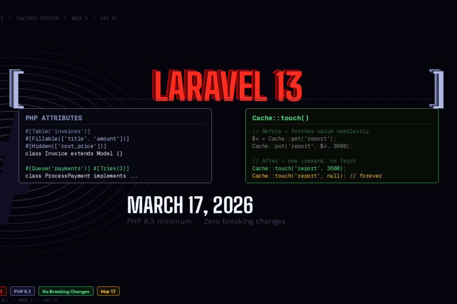Laravel 13 releases March 17, 2026 — two weeks from now. The upgrade requires PHP 8.3 minimum (up from 8.2), but beyond that it’s a remarkably smooth release. No breaking changes to application code. Two headline features that quietly clean up patterns you write every single day.