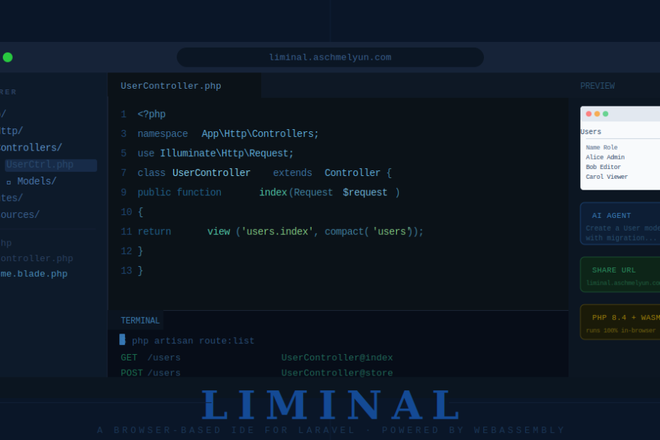 That’s exactly what Liminal delivers. Built by Andrew Schmelyun, Liminal is a browser-based IDE that lets you write, run, and preview Laravel applications entirely in the browser, with no server setup and no local PHP installation required. It’s one of the more ambitious developer tools to emerge from the Laravel community recently, and it’s worth understanding why it matters.