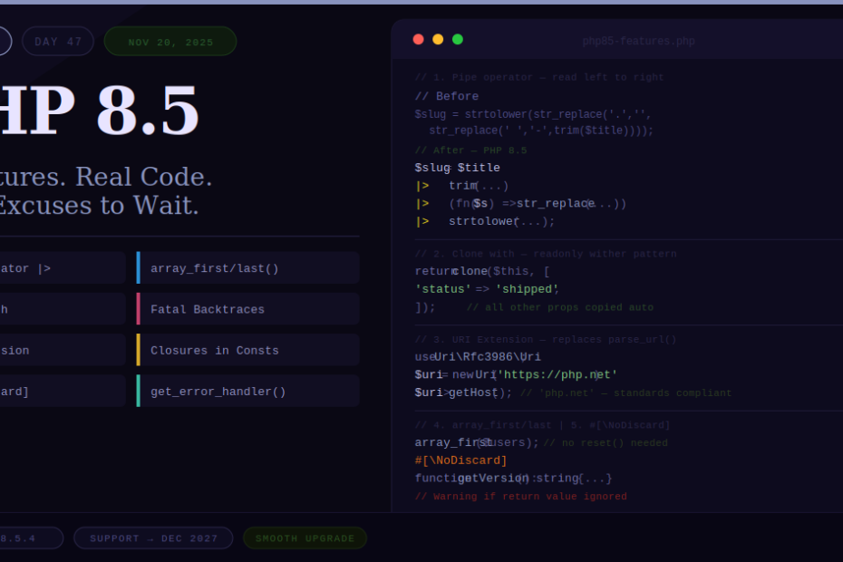 PHP 8.5 is the kind of release that rewards daily PHP developers the most. The pipe operator directly addresses one of the most common code-readability complaints in PHP. Clone with eliminates pages of boilerplate from immutable object codebases. The URI extension finally gives PHP a standards-compliant URL API. And array_first() / array_last() solve something so basic it’s almost embarrassing it took this long.