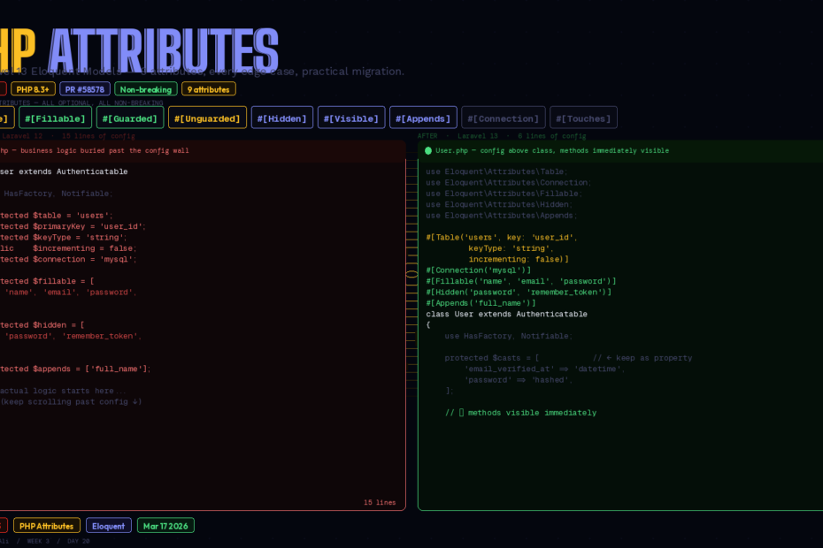 Laravel 13 — released March 17, 2026 — changes that. PR #58578 introduces native PHP Attributes as a first-class alternative to class properties for Eloquent configuration. The feature lands in ~15 locations across the framework, but models are where most developers will feel it most.