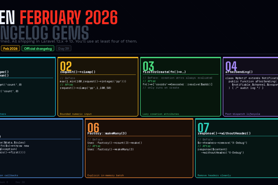 The official Laravel changelog for February 2026 is a quiet document. No launch events. No Laracon demos. Just a list of pull requests that shipped while everyone was writing about PHP Attributes and passkeys.