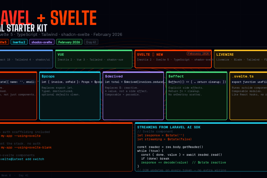 The Laravel Svelte starter kit is the missing piece for a non-trivial portion of the developer community. Svelte 5’s runes make it genuinely more ergonomic than it was in Svelte 4 — the composable .svelte.ts modules in particular bring the “extract to a hook” pattern that React developers rely on into the Svelte world, without the restrictions.